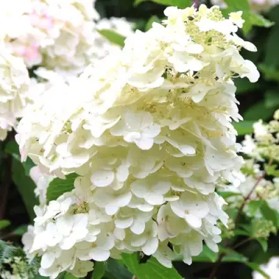 Гортензия метельчатая Юник (Unique) является настоящей классикой мирового садоводства, созданной в 1950 году в Антверпене. Этот декоративный кустарник относится к среднерослым видам и достигает высоты около 150 см, при этом его раскидистая крона может превышать 150 см в диаметре. Прочные буро-коричневые побеги растут прямо и уверенно держат крупные соцветия, не требуя дополнительной опоры. Куст украшен яйцевидными зелеными листьями с аккуратными зубчиками по краям, что делает его привлекательным на протяжении всего вегетационного периода. Данный сорт гортензии Юник ценится за гармоничное сочетание пышности и структурности, идеально подходя для одиночных и групповых посадок, а также создания плотных живых изгородей.