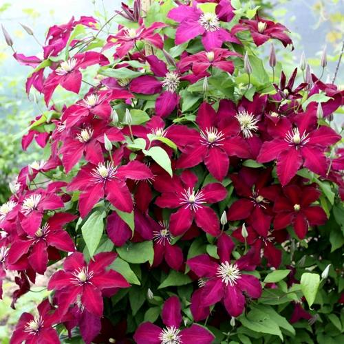 Клематис Мазовше отличается мощной силой роста. В высоту лиана достигает 3-3,5 м. Зацветает красивыми большими цветками в июне, цветение продолжается все лето. Бархатистые цветы диаметром 15-20 см, бордового цвета, состоят из 6 лепестков. Цветет обильно, если обеспечить ему хорошие условия выращивания. Растение выдерживает низкие температуры, проявляет стойкость к возбудителям заболеваний. Цепляется за опоры листовыми черешками. Годится для выращивания у ограждений, беседок, сеток, решеток и других садовых опор.