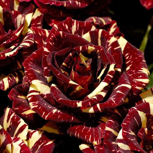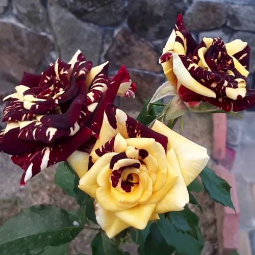 Абракадабра привлекает внимание своей уникальной окраской. Бутон имеет темно-бордовый цвет с лимонно-желтыми мазками и полосами, которые при раскрытии превращаются в темно-красно-коричневые цветы с такими же яркими лимонными акцентами. Основная окраска цветка – красная, что создает контраст и делает его выделяющимся среди других роз. Цветы отличаются бокаловидной формой и имеют высокий центр с заостренными лепестками, придавая им элегантный вид.