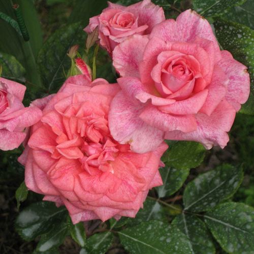 Бутоны розы "Пьер Карден" имеют темно-розовый цвет с малиновой звездной пылью, что придает им дополнительный шарм и утонченность. По мере распускания, цветки раскрывают розовые лепестки с насыщенными темно-розовыми и малиновыми оттенками, образуя эффектный контраст. Основная окраска цветка — розовая, яркая и насыщенная. Бутоны имеют бокаловидную форму, а цветки — чашевидные с высоким центром, что придает им классическую элегантность. Цветки крупные — диаметр достигает 10-12 см, что делает их заметными и выразительными. В каждом цветке около 30-35 лепестков. Одиночное расположение цветков на стебле акцентирует внимание на их красоте.
