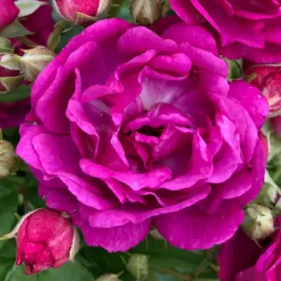 Основной акцент — это выразительные махровые цветки насыщенного пурпурно-фиолетового оттенка. Диаметр бутонов около 5 см, лепестки собраны в плотную чашевидную форму. Цветки собраны в аккуратные соцветия по 3–7 штук. Цветение повторное, с июня до октября, в несколько волн. Аромат приятный, умеренно выраженный, с фруктовыми оттенками. Цветки не боятся дождя — не размокают и не теряют форму, что делает сорт особенно ценным для регионов с нестабильным климатом.