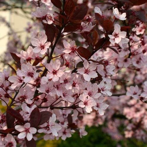 В мае слива начинает цвести чашеобразными ярко-розовыми цветами, которые со временем становятся красными. Цветки до 2,5 см в диаметре создают легкую, но яркую атмосферу в саду, заманивая пчел и других опылителей. Плоды у сливы небольшие, имеют шаровидную форму и темно-красный цвет. Их сочная мякоть обладает великолепными вкусовыми качествами — они идеально подходят как для свежего потребления, так и для обработки.