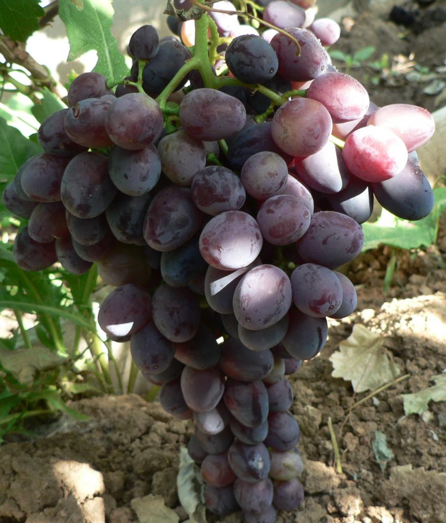 Грозди крупные и умеренно плотные. Ягоды темно-синие с густым восковым налётом, овально-яйцевидные, весом 7–10 г. Мякоть плотная, мясистая, с гармоничным вкусом и лёгким мускатным ароматом. Побеги полностью вызревают, а черенки быстро укореняются.