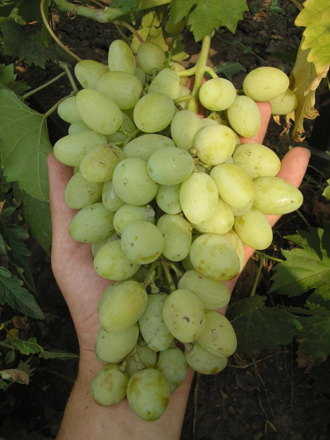Сорт очень вкусный. Грозди внушительные (обычно 600–1100 г, иногда до 2 кг), ягоды крупные (9–12 г), при полном созревании приобретают красивый янтарный загар.В холодное или слишком дождливое лето мускат может «уходить» или быть очень слабым. Сорт очень плодовитый. Если не проводить нормировку (не удалять лишние грозди), ягода будет мелкой, а лоза не успеет вызреть к зиме.