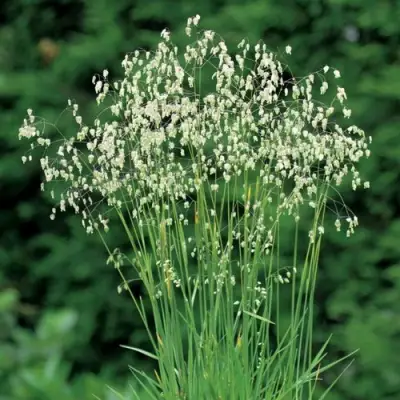 Цветение — эстетическая кульминация. С мая по июль над листвой поднимаются ажурные метёлки, усыпанные поникающими колосками — в форме капель или сердечек. На старте они зелёно-розоватые, ближе к лету становятся золотистыми. Размер одного колоска — до 1 см, длина метёлки — до 7 см. Даже слабый ветер приводит их в движение, создавая эффект «живой» текстуры. А вот аромата у цветков нет, что делает растение универсальным — оно не отвлекает внимание и не провоцирует аллергию.